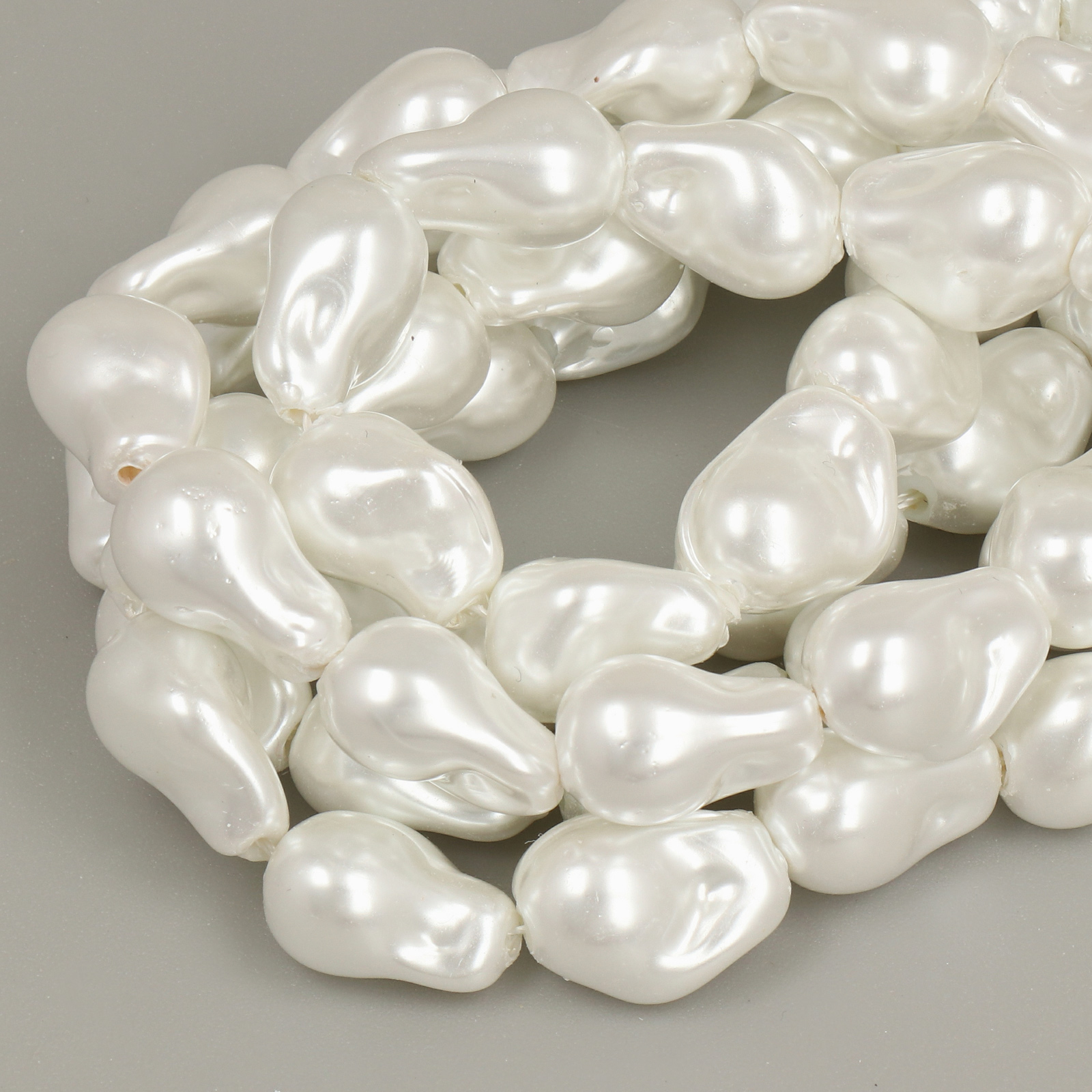 Le perle Shell Beads rappresentano, ad oggi, la miglior imitazione delle perle naturali. A differenza di altre imitazioni di perle, realizzate in vetro o acrilico, queste sono prodotte con vera conchiglia il che, oltre ad aumentarne il valore, conferisce alle perline un peso molto più sostanzioso e simile a quello delle perle naturali. Dopo esser stata tagliata e levigata nella forma desiderata la perla di conchiglia viene sottoposta a un sofisticato processo di coating che riproduce il colore e il riflesso perlaceo tipico delle perle naturali.